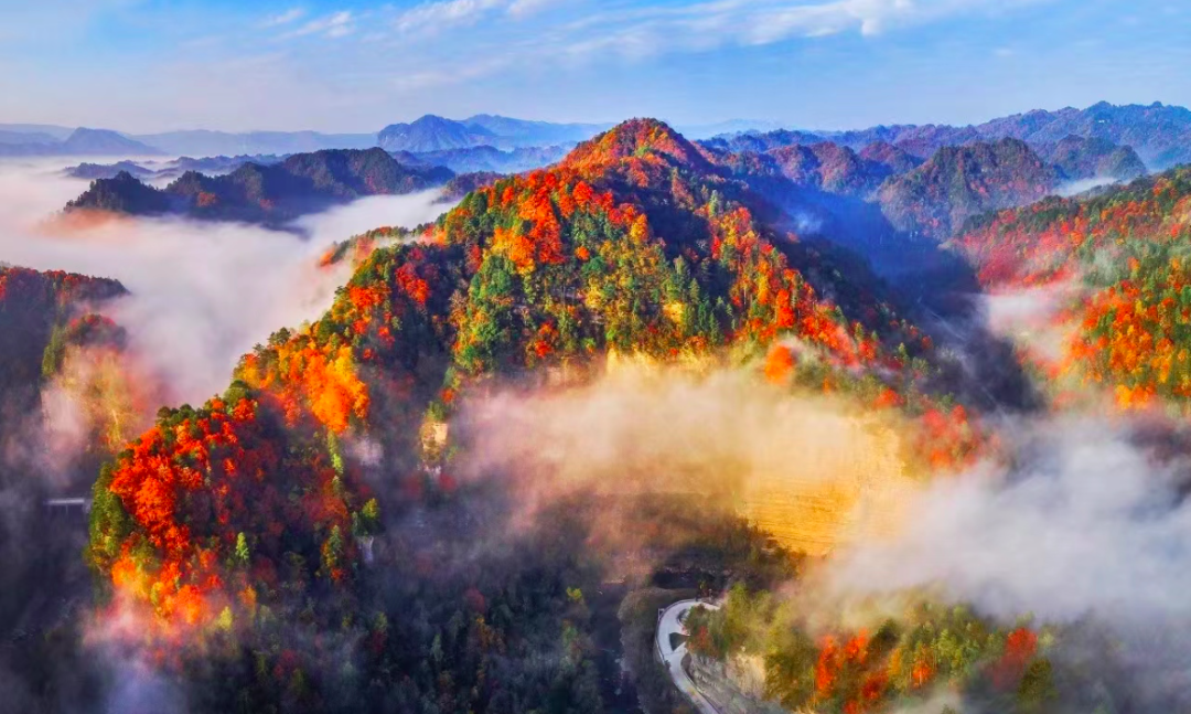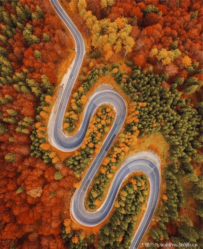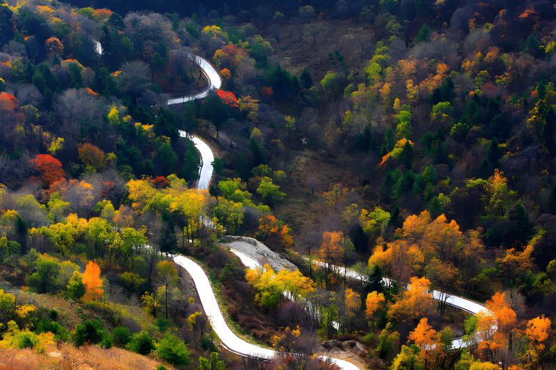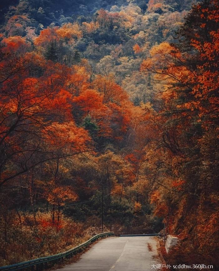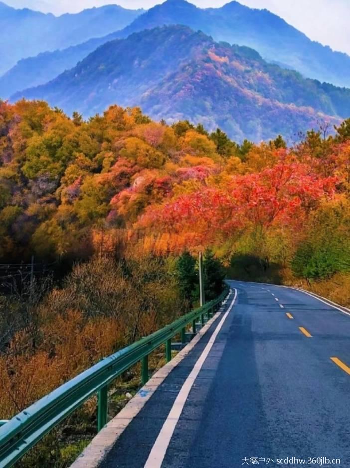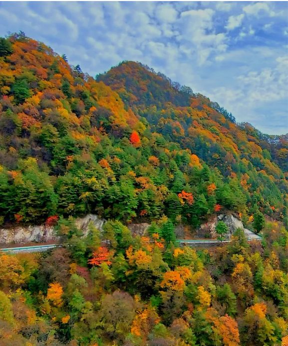 道路两侧的山峦,在秋天里像是被大自然打翻了调色盘。各种树木的叶子交织在一起,红的似火,黄的像金。