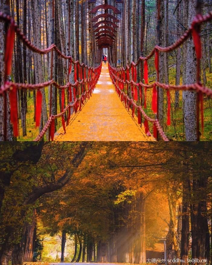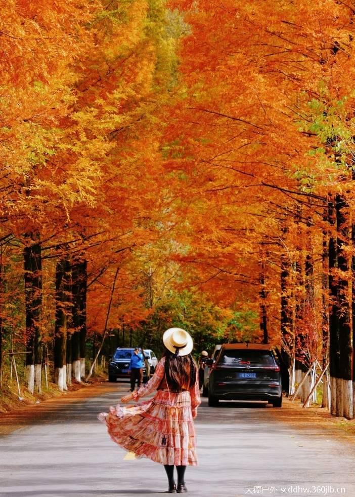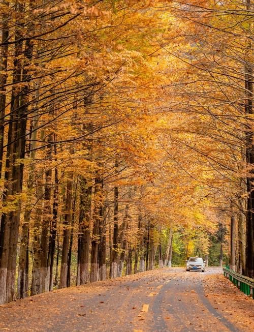 那沿路的水杉树,成为视线中两条金色的飘带,揉碎了无数阳光洒向游人的肩头!