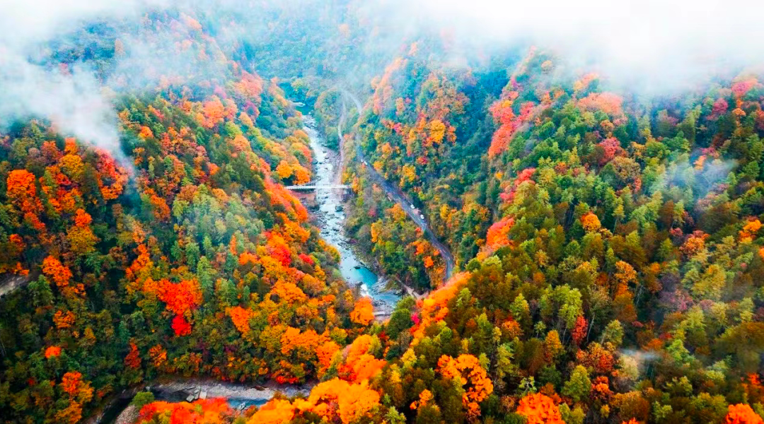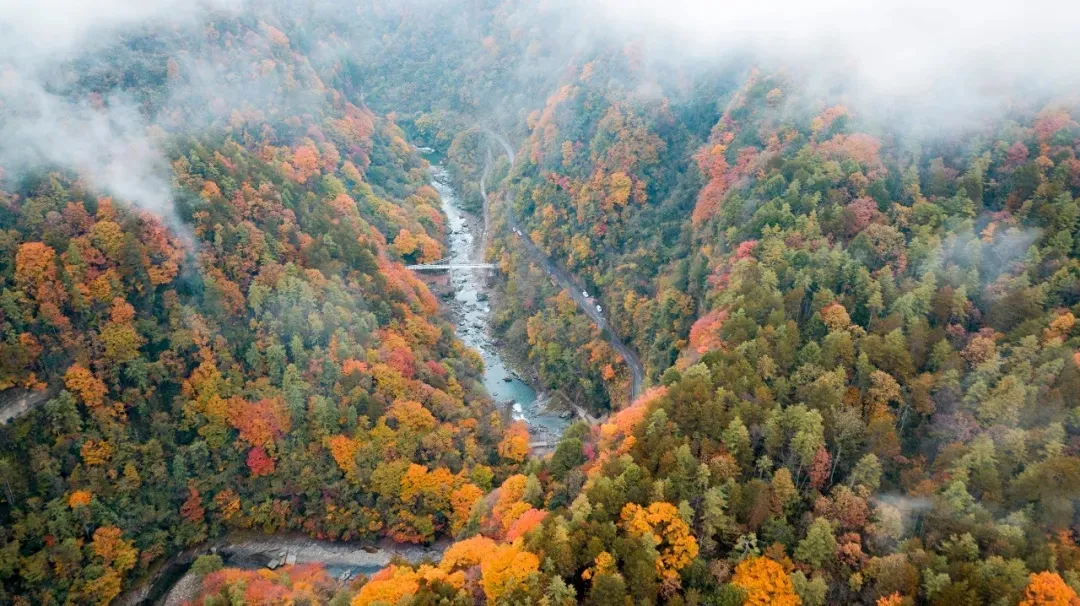 开车路旁即身临云雾仙境之中,云雾缥缈间,从容俯视群山红叶,丹树千林,留坝红叶的磅礴盛宴便徐徐展现。
