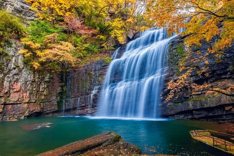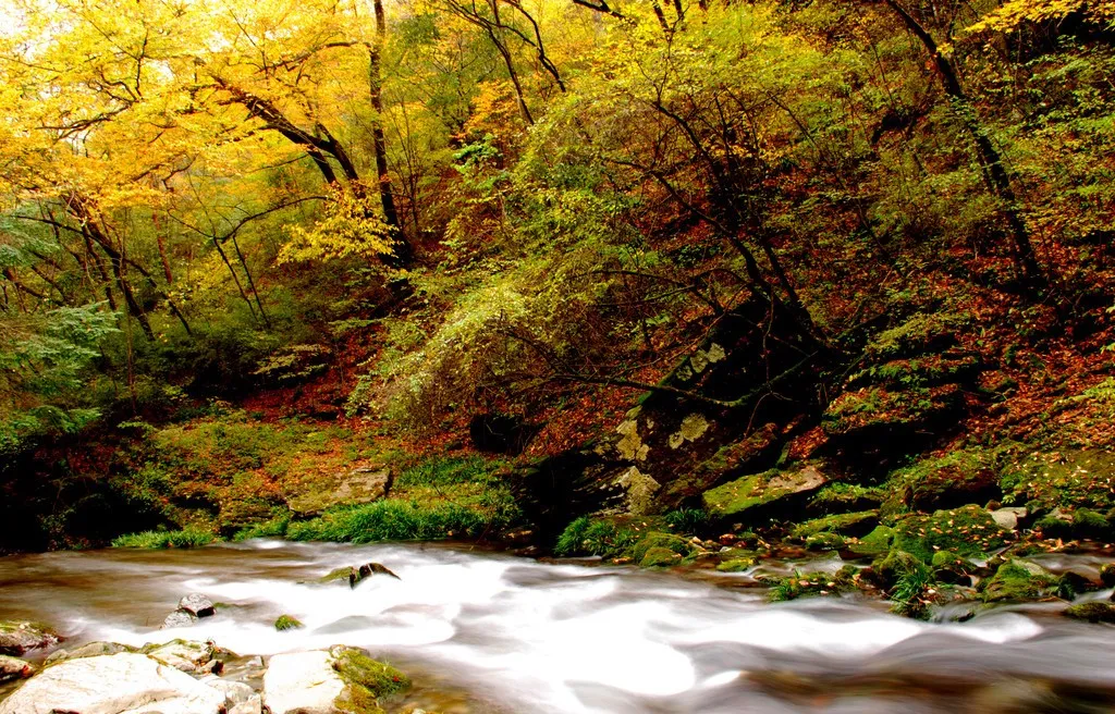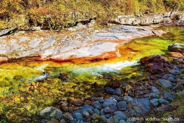 大箭沟的灵性,皆在水色。走近细观,溪水清澈如镜,无色透明,仿佛天地间最纯净的琼浆。然而,当目光远眺,水的色彩便如魔术般显现:河岸岩石泛着温柔的淡红,似少女羞赧的脸颊;瀑布飞溅处,白浪中裹挟着黄绿,如碎玉缀翡翠;深潭静卧时,碧水沉淀为深邃的祖母绿,倒映着两岸的红枫与蓝天,仿佛一块镶嵌在山间的翡翠。这种“近看无色,远观生彩”的奇妙,源于太白山冰川融水经花岗岩过滤的纯净,更因河床彩色矿物质的千年沉淀,成就了一沟流动的斑斓诗行。