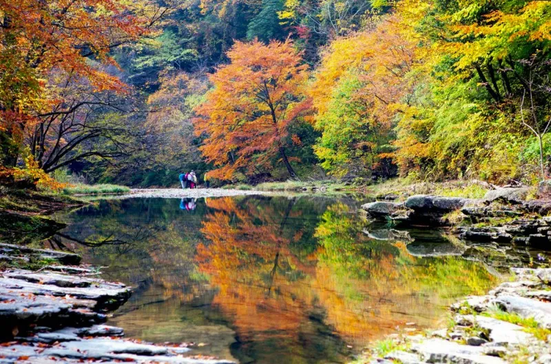 黄柏塬的秋色迷人,和独特的地理环境脱不开关系,这里森林覆盖率达96%以上,层峦叠嶂,山清水秀,植被丰富,空气清新,既有北国风光,又有江南秀色,汇南北风情于一域。