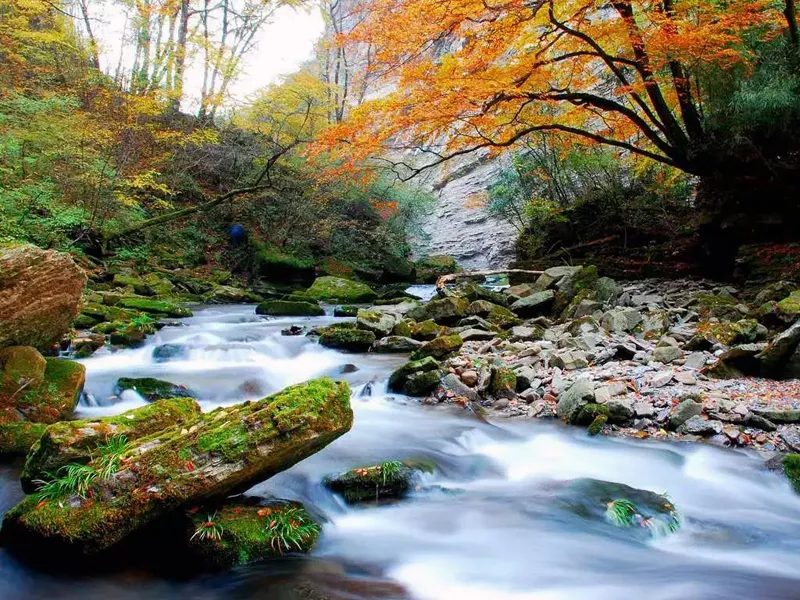 每逢金秋时节,黄柏塬漫山红遍,气势壮观。红叶色彩丰富,五彩斑斓,呈现出红、橙、黄、绿等10余种色彩,染尽千山万壑、浸透溪流瀑潭。