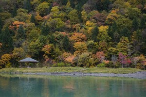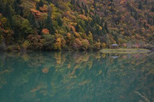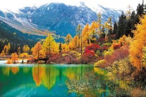五彩斑斓的树林倒映在晶莹剔透的海子里