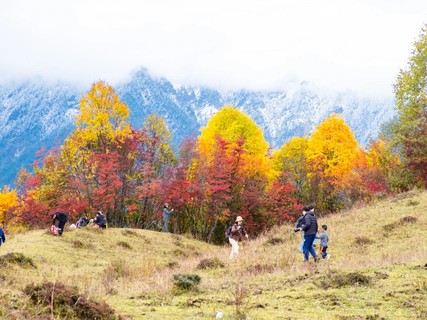 车上领队讲解行程安排及注意事项,预计10.00到达下车点。乘坐中转车前往徒步起点(中转费往返30元/人,车上另收),简单活动身体后,跟随领队开始徒步,一路拾阶而上,穿梭在秋的油画里,欣赏色彩的丰富,远看云雾缭绕;中午在坐在金黄的高山草甸上,就着淡淡的牛屎清香,享用自带豪华路餐,在蓝天下、白云里继续放飞自己,拍摄美照,下午适时返回乘坐中转车下山。16:00集合上车开始返程。
