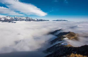 2、遥望高高的美丽神山,云游中有一条通天的路,置身于一片星空下,遥望一片云海。